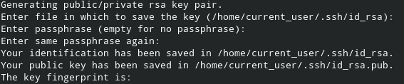- Generate you local machines key by running the ssh-keygen command in the terminal. It will ask for a storage location (default: /home/current_user/.ssh). Then you will be asked to input a passphrase, leave it empty ! The output should look like this.